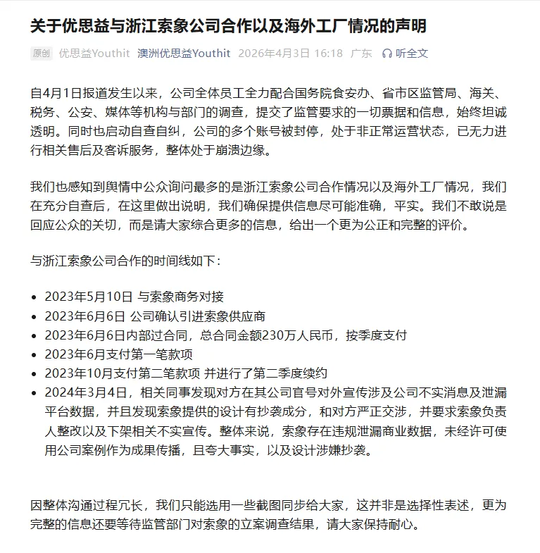 4月3日,优想益发布对于优想益与浙江索象公司协作以及国外工场情况的声明,全文如下: