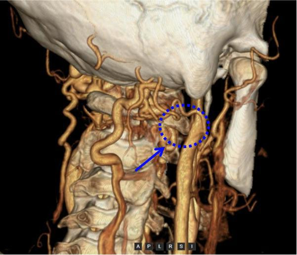 CTA查验教导右侧寰椎横突压迫颈内静脉(蓝色箭头所示压迫位置)