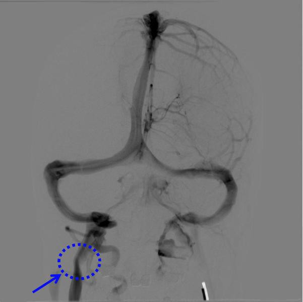 脑DSA查验透露右侧颈内静脉狭隘(蓝色箭头所示)