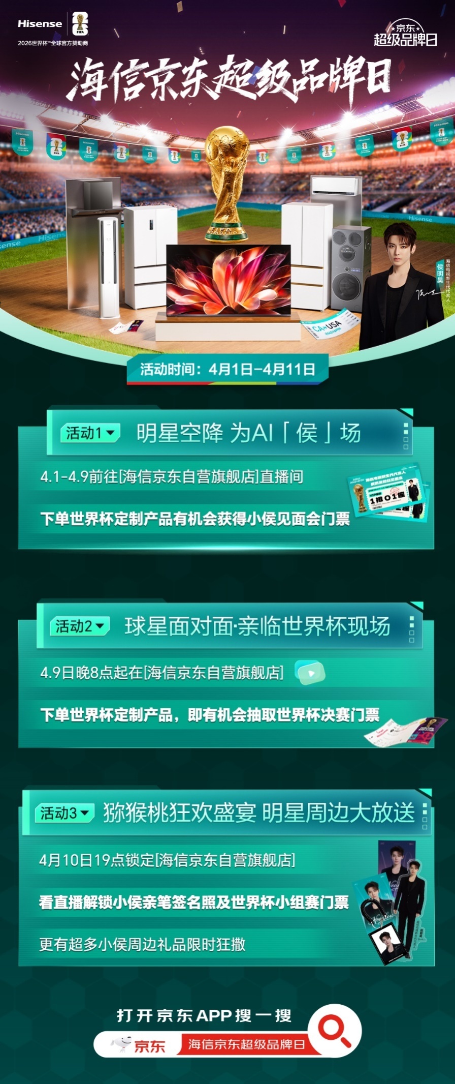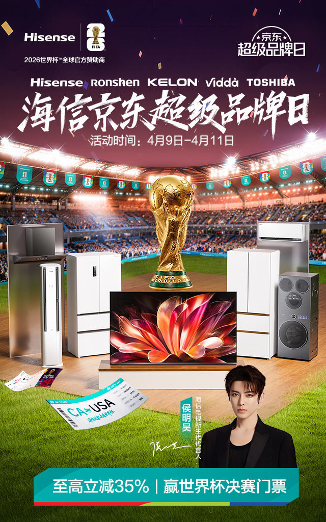 4月9日20点起,上京东搜索“海信京东超等品牌日”,一键焕新不雅赛家电,奔赴你的天下杯之约!