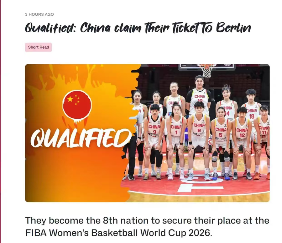 外洋篮联在官网发文进行了祝愿,著述默示:中国女篮成为第八支赢得天下杯正赛履历的军队,亦然首支通过履历赛赢得天下杯正赛履历的军队。著述还列举了中国女篮过往在外洋篮联女篮天下杯上的收货:曾11次进入女篮天下杯赛事,1983年头次参赛时就夺得季军,最好收货是1994年、2022年天下杯上赢得的亚军。