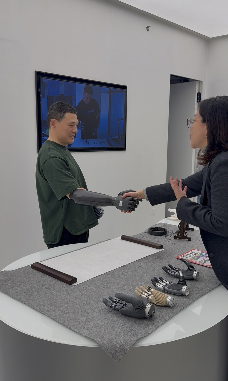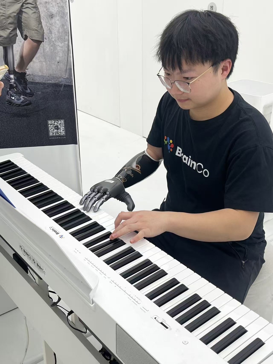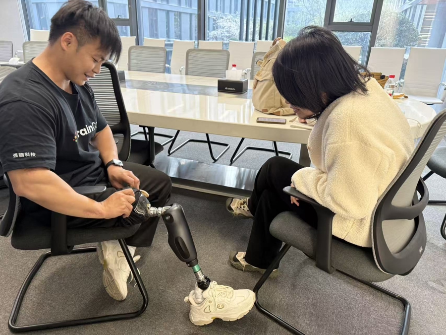 改革发生在2022年。大学毕业时,周键通过基金会技俩报名安装了强脑科技的智能仿外行,第一次体会到了敌手指的精确截止——假肢通过传感器及时网罗皮肤名义的微小生物电信号,将他的每一个意图解码为请示,驱动对应手指作念出反映。这种截止,精采到足以竣事逐指的孤独截止。几个月后,他入职强脑科技公司,成为仿外行研发测试兼体验官,参与居品的使用、测试或展示责任。