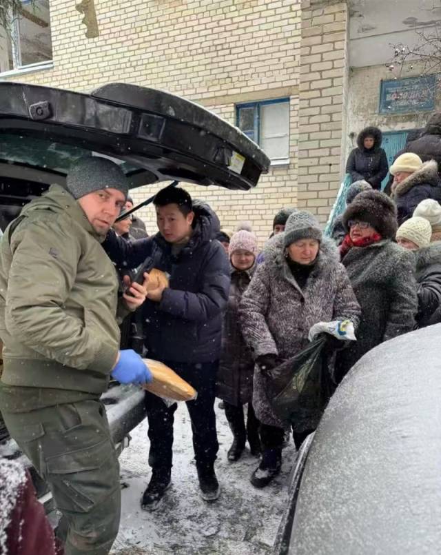 柯义(左二)为乌克兰群众提供援救。受访者供图