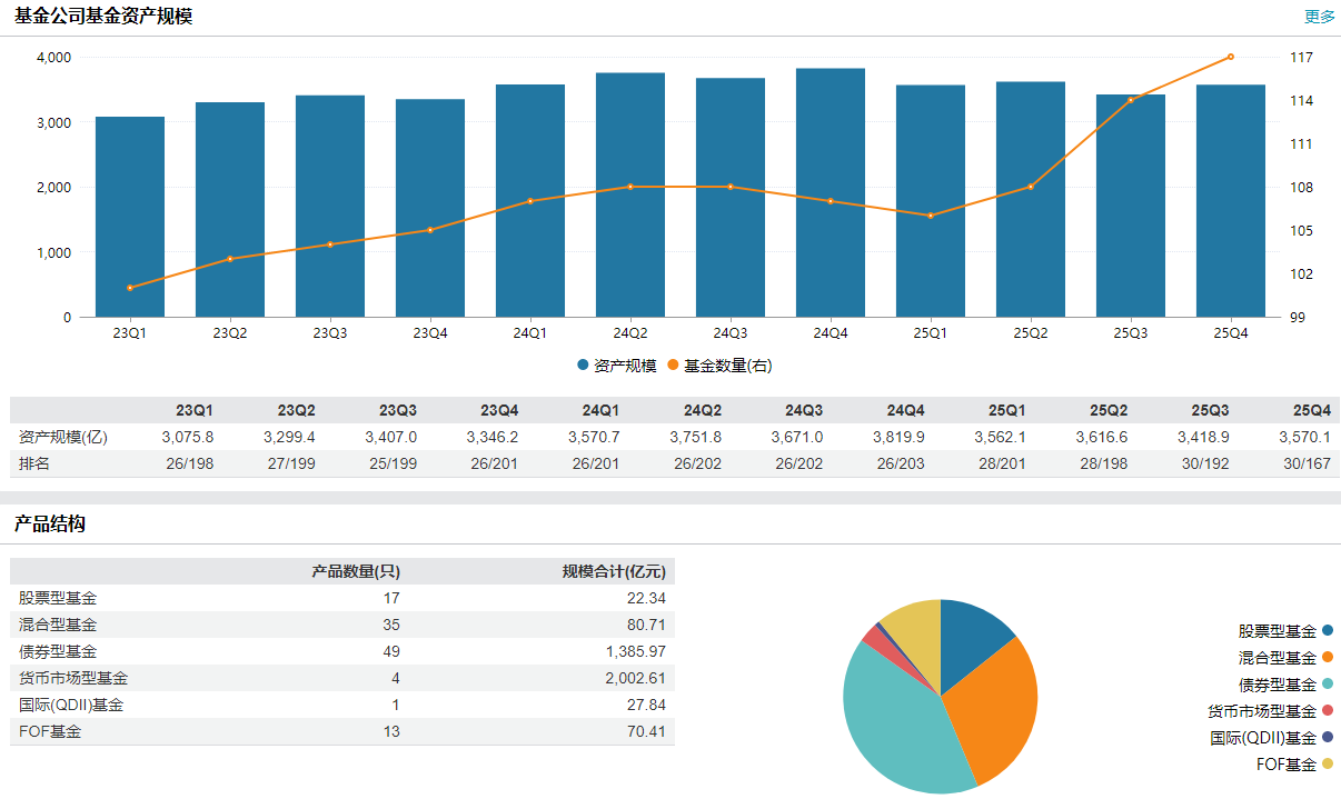 从家具结构看,固收业务如故公司的中枢底盘,债券型基金畛域超1385亿元,货币基金超2000亿元,两者共计占比近95%。与此同期,权利类家具畛域相对较小,股票型与羼杂型基金共计约105亿元。